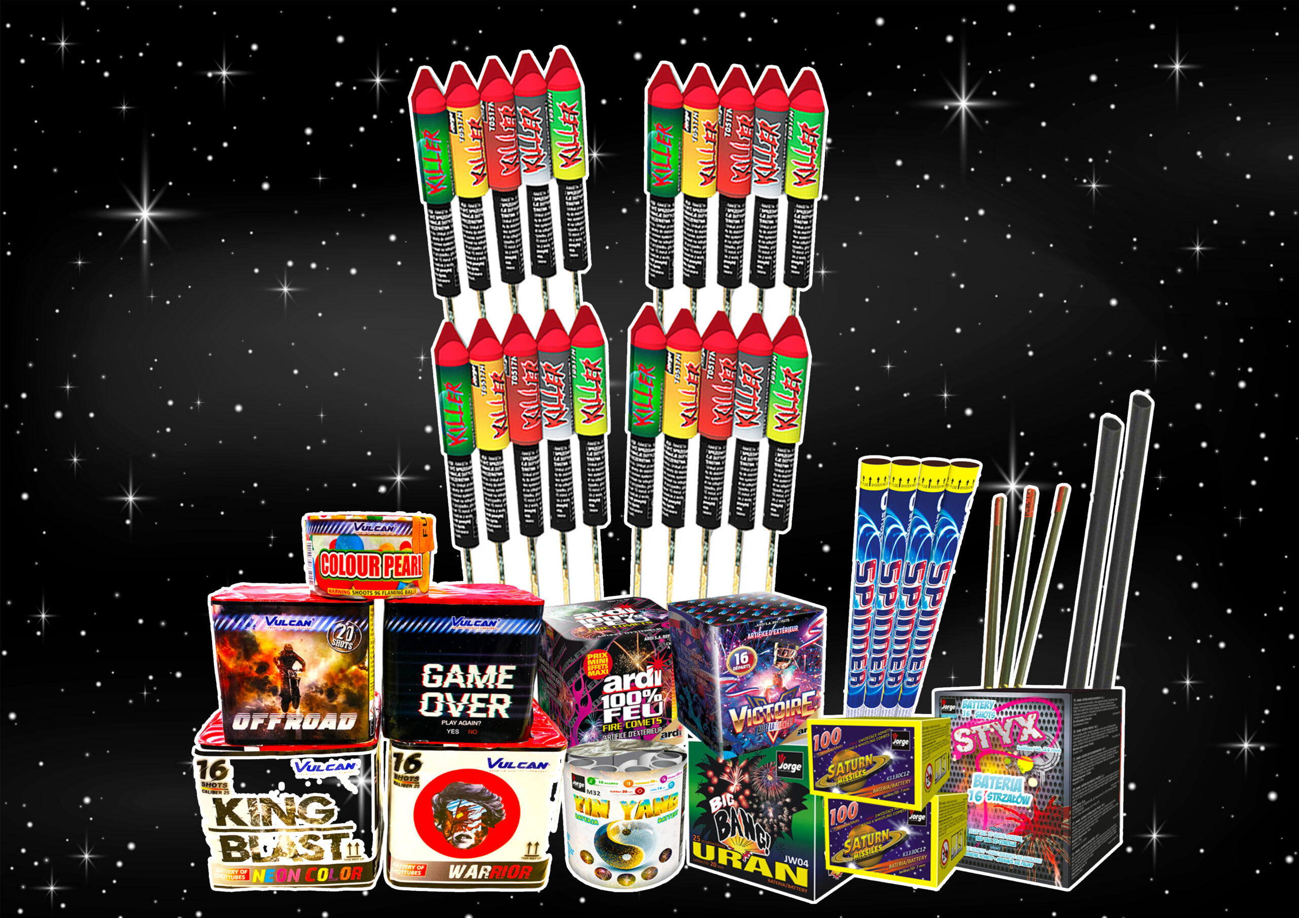Unmatched Variety: Enjoy a fantastic selection of fireworks, with a special emphasis on aerial rockets and impressive display cakes.